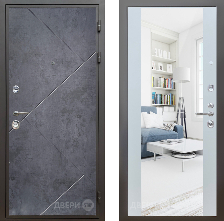 Входная Дверь Шелтер (SHELTER) Комфорт Бетон урбан индиго 13 с зеркалом Белый матовый 860x2050 мм